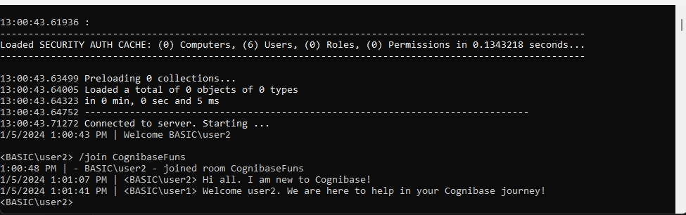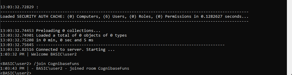 The Chat console app is a console application that starts a Cognibase Client Object Manager and then the user can join one room and exchange messages in this room. The user can also leave a ChatRoom.