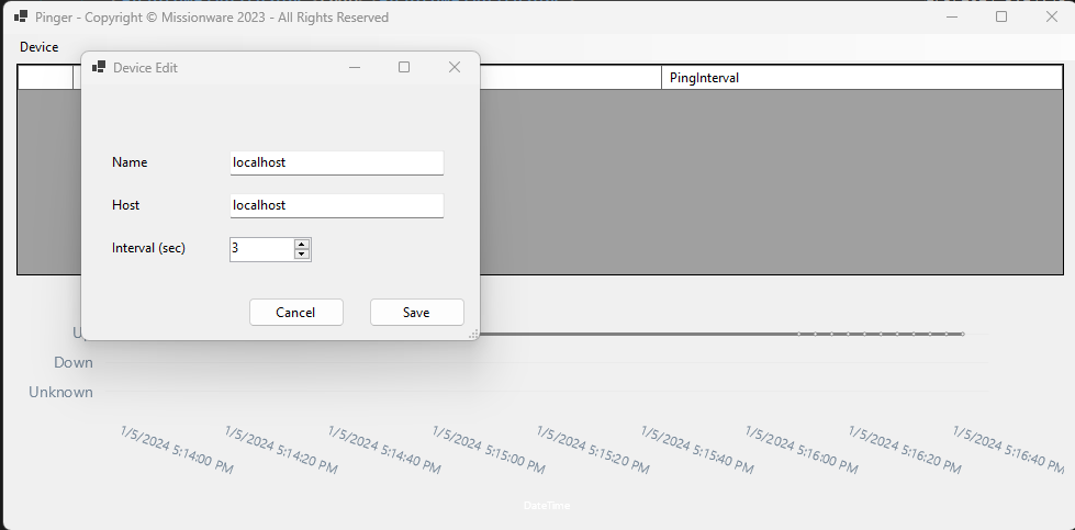 - After login you can add a Device. Click the Device->Add menu item. Then enter a friendly name, the host address and the pinging interval and click OK.