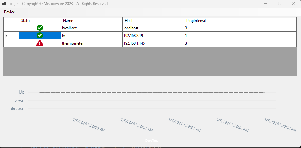 Represents the device. This item contains the configuration (friendly name, host, interval) as well as it has a calculative property that is wraps the actual ping result.