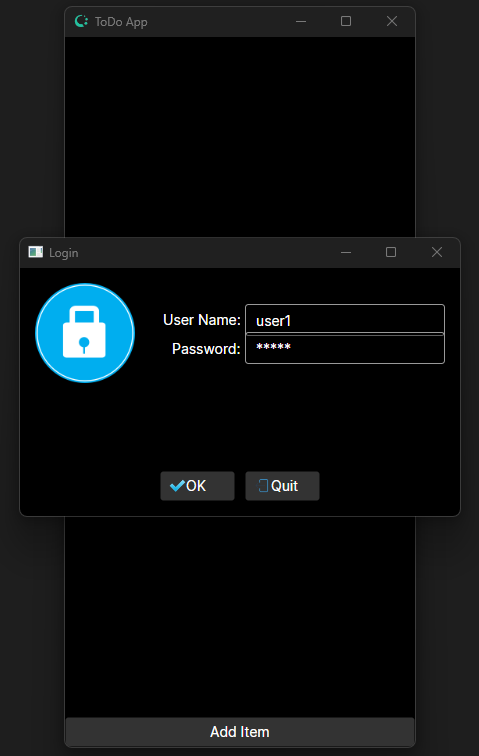 The bootstrap code is written in the MainWindow.axaml.cs class. During the opening of the Window, it uses the component AvaloniaStartupHelper that provides ready to use components for login and initialization. This component shows the standard Avalonia login popup and performs the login. It also offers two delegates, a Quit action delegate that is used normally to terminate the app and a load action that is used to execute after login to perform the initial reading of a DataItemCollection (Live Collection) of all ToDo items.